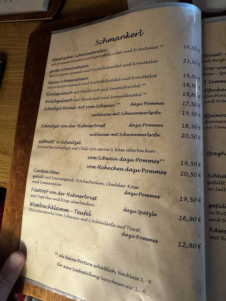 At Gasthof Wimbachklamm, nestled in the scenic Ramsau bei Berchtesgaden, the menu is a culinary delight that celebrates local flavors. Guests rave about the hearty Wiener Schnitzel, expertly prepared to satisfy any appetite after a long trek. The pork knuckle, with its perfectly crispy skin, paired with fresh coleslaw and red cabbage, stands as a testament to the restaurant’s commitment to quality. For a taste of the wild, the deer goulash offers tender meat steeped in rich, flavorful sauce. As a sweet finale, the Kaiserschmarrn dessert—light and fluffy—served with apple sauce, is simply divine.